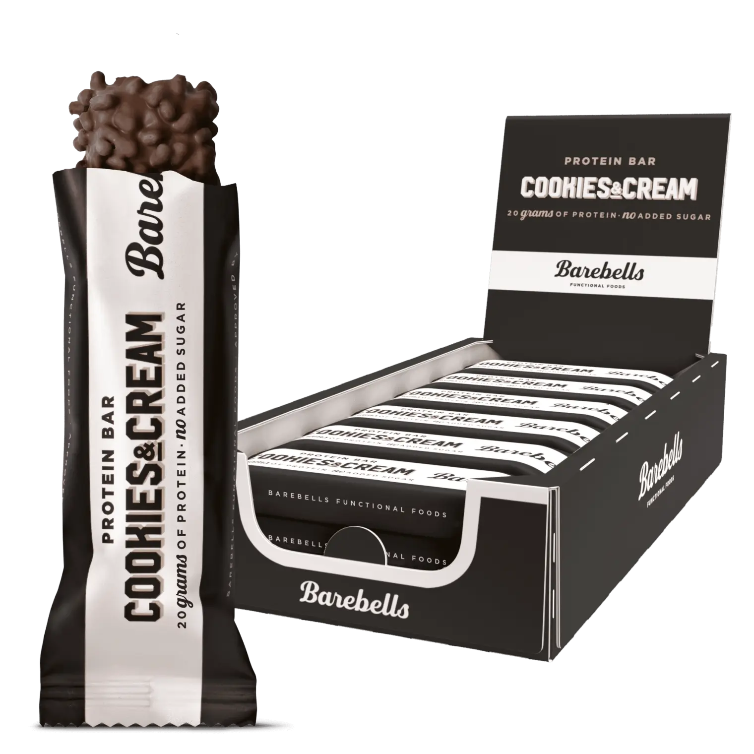 Da Barebells blev lanceret i Danmark tilbage i 2016, var Barebells Cookies & Cream proteinbar blandt de tre produkter, som var med. Den blev hurtigt taget enormt godt imod af danskerne, og har siden været en del af det det faste sortiment af proteinbars, som nu består af 10 forskellige smagsvarianter. Skal den lette sult stilles på farten, proteindepoterne fyldes op efter træning, eller har du bare brug for at tilfredsstille den søde tand? Så bør du give Barebells Cookies & Cream et skud. Med et knasende element fra sojapuffs, det søde fra mælkechokoladen, og bløde fra den fluffy proteinmasse, vil den tilfredsstille de fleste munde. Barebells Cookies & Cream proteinbar er beriget med 20 gram protein, indeholder 194 kcal pr. bar og er uden tilsat sukker.Satisfy your crazy cravings with this crunchy and delicious treat!