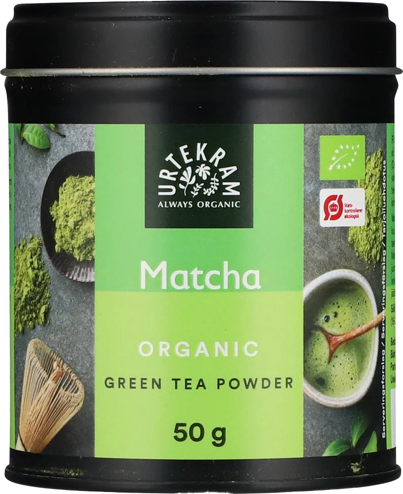 Grøn matcha tepulver laves af unge grønne teblade og har en naturlig, intens grøn farve fra klorofyl. Smagen er let sød med en mild bitter note. Pulveret indeholder naturligt koffein og kan bruges til te, latte eller madlavning.