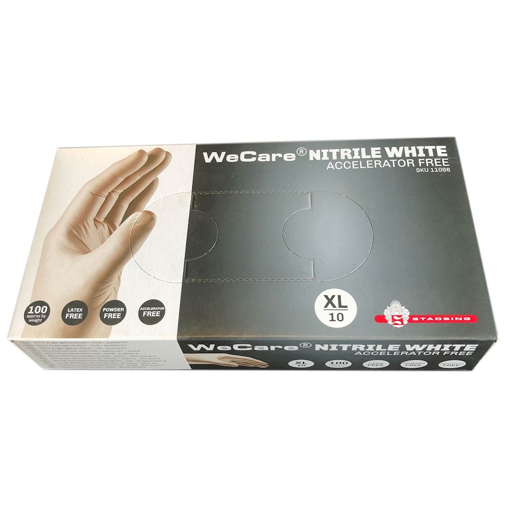 WeCare Nitrile White er en hvid pudderfri engangshandske der mindsker risikoen for allergi, da handsken er acceleratorfri. Handsken er velegnet til rengøring, plejeopgaver og håndtering af fødevarer. Engangshandsken er fremstillet af nitril og har en rullekant, der gør det lettere at få handsken af og på. Overfladen er let præget for bedre gribeevne. Handsken kan anvendes på både venstre og højre hånd. Handsken opbevares mørkt og køligt i 5°C til 25°C og skal kasseres efter brug. Den hvide farve sikrer sporbarhed ved håndtering af fødevarer. Pudderfri Mindsker risikoen for allergi Overfladen er let præget for bedre gribeevne Kan både anvendes på venstre og højre hånd Den hvide farve sikrer sporbarhed ved håndtering af fødevarer