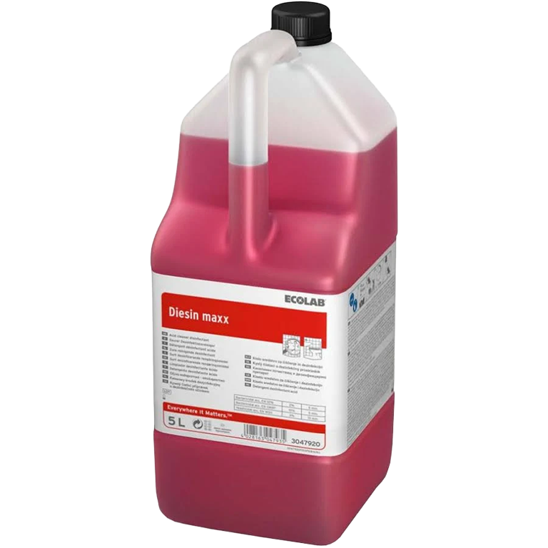 Diesin Maxx desinfektionsmiddel 5 liter er et effektivt rengørings- og desinfektionsmiddel med stærk antimikrobiel virkning. Det fjerner snavs og kalk grundigt og efterlader en frisk duft. Produktet bevarer sin kalkopløsende effekt selv ved fortynding og kan anvendes på alle vand- og syreresistente overflader. Ideelt til brug i institutioner, hospitaler, sportshaller og svømmehaller. Bakteriedræbende og svampedræbende iht. EN-standarder.