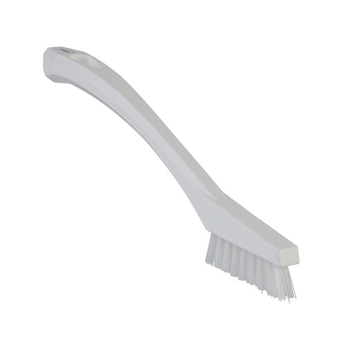 Indhold: 1 stk Lille kompakt håndbørste, som er velegnet til rengøring omkring pakninger, gummilister og samlinger på maskiner, rengøring af cement- og gummifuger og udstyr som f.eks. transportbånd.