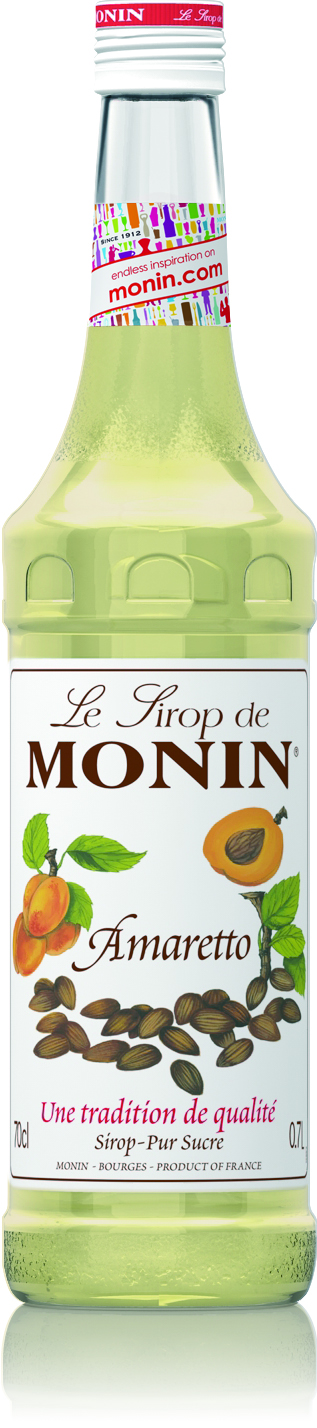 Monin Syrup Amaretto er baseret på den klassiske italienske søde mandelsmagende likør og abrikoskerner. Karakteriseret af den karakteristiske smag af den bitre mandel, navnet Amaretto betyder ’en lille bitter’ på italiensk. Det siges at Monin Syrup Amaretto går helt tilbage til den italienske renæssance. Legenden siger at i 1525 blev kunstneren Bernardino Luini, elev af Leonardo Da Vinci, bestilt til at male et kalkmaleri af Madonna af miraklerne i Saronno. Han valgte en smuk lokal kroejer til at inspirerer hans portræt af Madonnaen. Som en gave for at vise hendes taknemmelighed og hengivenhed, fyldt hun abrikoskerner i cognac og præsenterede den resulterende ravfarvet væske for Luini. Monin Syrup Amaretto præsenterer en naturlig række farver og en stærk mandel og fersken aroma, der ledsages af en bittersød smag af mandel og frugtagtige noter, som fortsætter ind i eftersmagen. Monin Syrup Amaretto kan bruges til at lave en luksuriøs Tiramisu Cappucino og mange andre fristende italienske desserter og drinks.