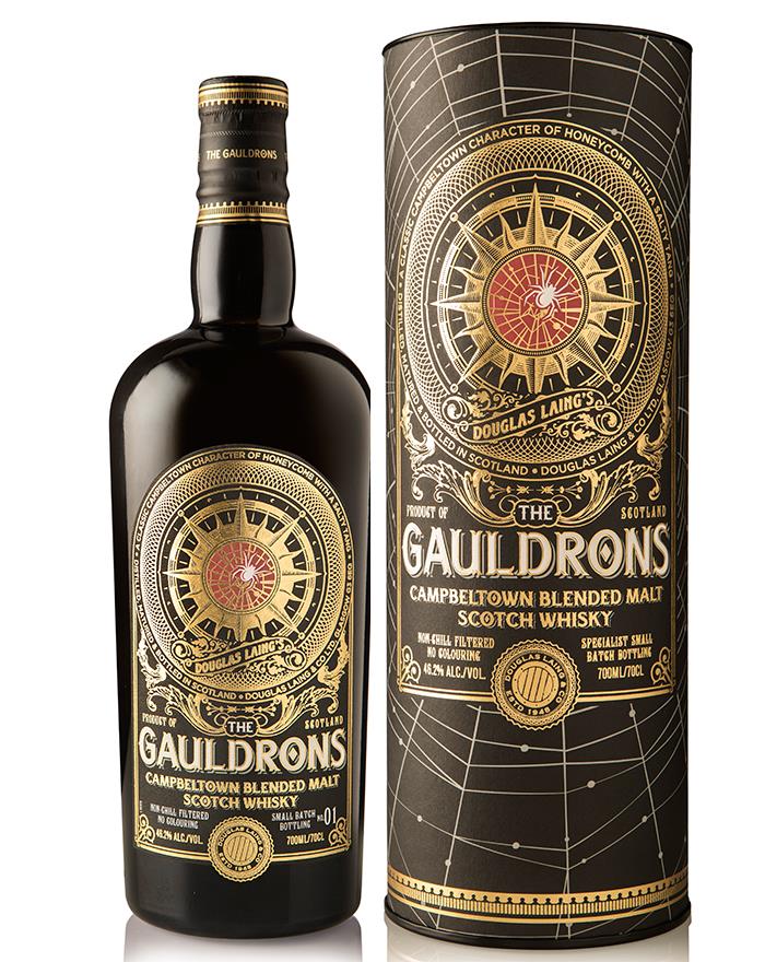 The Gauldrons Campbeltown Blended Scotch er del af destilleriet Doulas Laings ”Remarkable Regional Malt Series”. Og denne whisky er opkaldt efter den skotske by Campbeltown, der er kendt som ”stormenes bugt”. Flaskens unikke design relaterer sig til historien om kong Robert Bruce, som blev inspireret af edderkoppespind til at fortsætte kampene mod fjender. Smagen er karakterfuld og kompleks med søde noter af honning og mere salte nuancer, der komplementerer hinanden på fin vis.