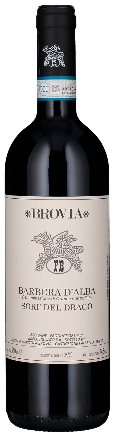 Brovias Barbera d'Alba - Sori del Drago er lavet på druer fra Castiglione Falletto og Serralunga d'Alba, hvor Brovia har nogle af sine bedste vinmarker, herunder Garblét Suè, Brea og Gianetto. Jorden består primært af ler og kalk, og markerne dækker et samlet areal på 1,6 hektar. De ældste vinstokke blev plantet i 1970, og de yngste i 2003. Druerne håndplukkes normalt i slutningen af september eller begyndelsen af oktober. Efter høsten presses druerne og gærer i rustfri ståltanke ved kontrolleret temperatur i 8-10 dage. Vinen lagrer derefter i 15 til 18 måneder, afhængig af årgangen, og tappes på flaske uden filtrering. Barbera d'Alba - Sori del Drago er en let drikkelig, dybrød vin med en intens duft af mørke bær, sød tobak og modne blommer. Smagen er forfriskende med en afbalanceret syrlighed og en god længde. Den egner sig til lettere retter og bør serveres ved en temperatur på omkring 13-14 grader.